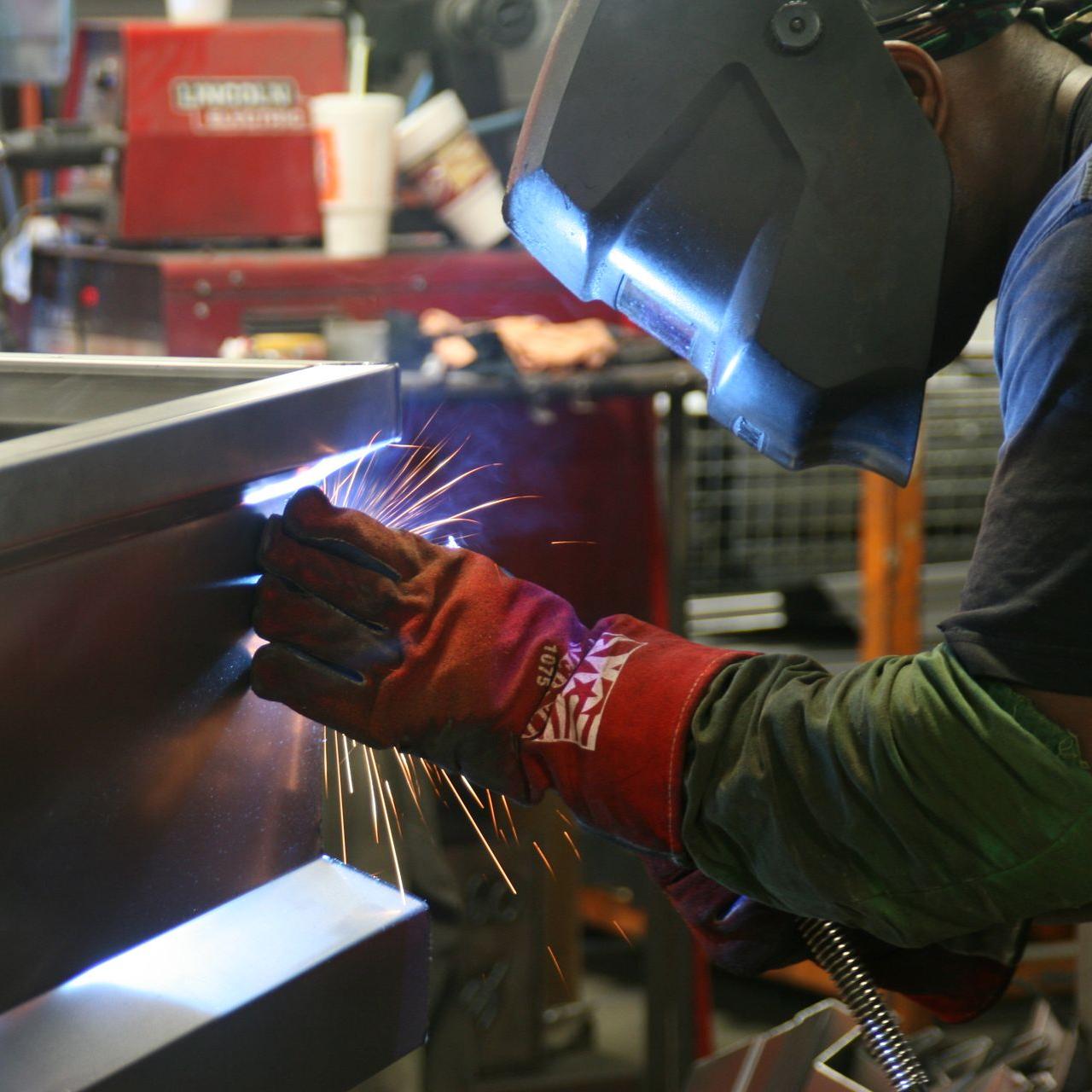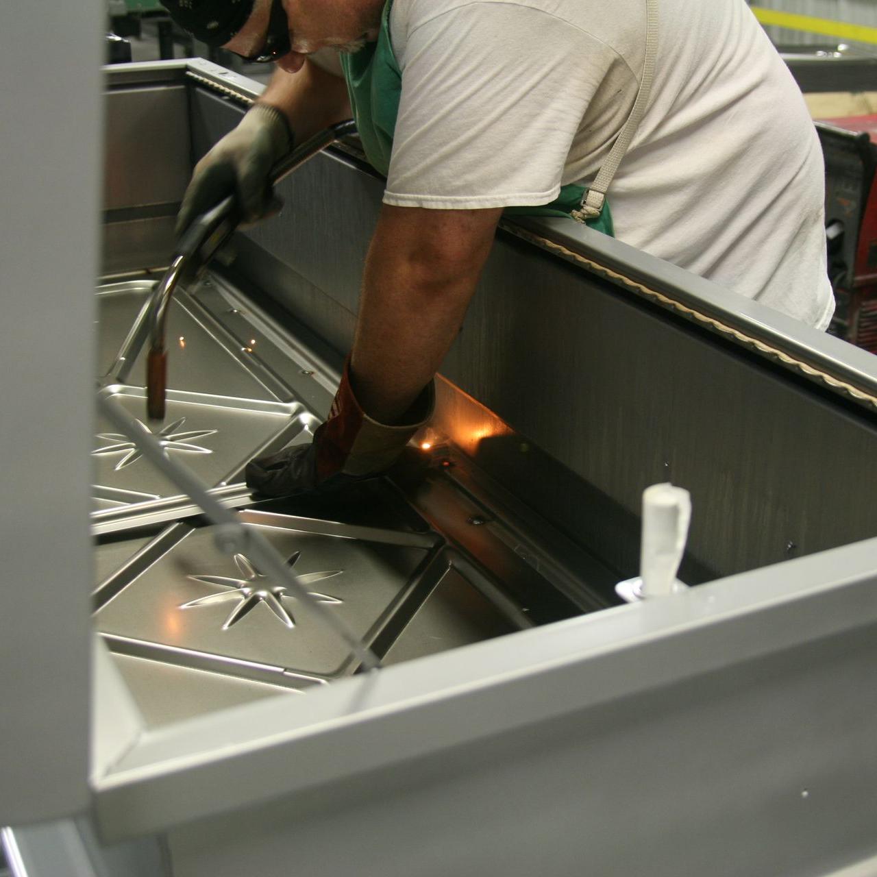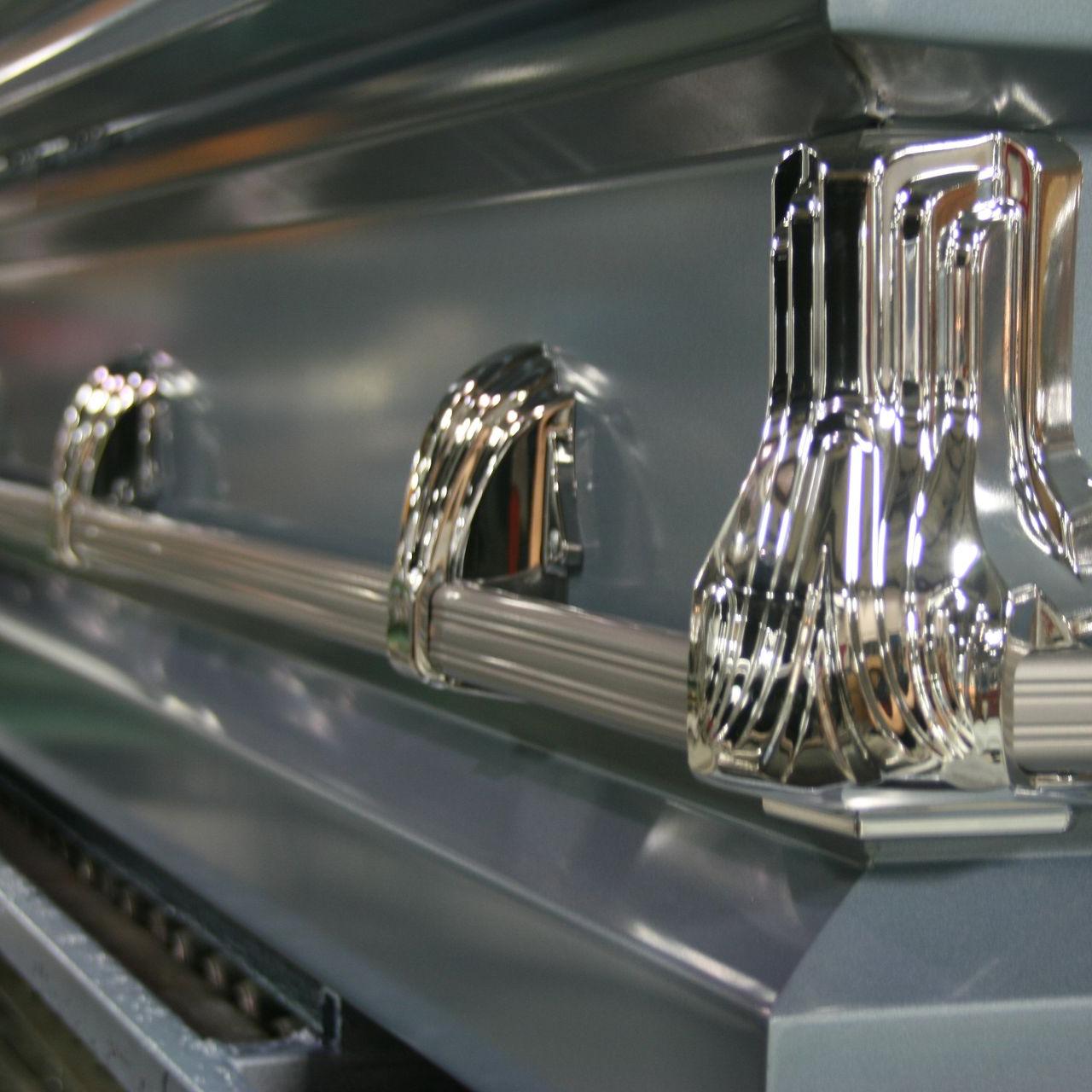 In the metal fabrication department, the process starts with raw metal parts that have been pre-stamped from cold-rolled steel coils. Several welding stations are set up to weld the portion of the casket that forms the box. Simultaneously with the fabrication of the casket box, a group of welders will be welding together the parts of the pre-stamped lid. After all the welds are made on the box and lids, these parts pass through several people who will grind off the excess welds, making all areas of welding smooth. Once all grinding and welding is complete, the casket will then pass through an inspector who inspects the casket for any metal fabrication defects prior to moving forward into the paint department.